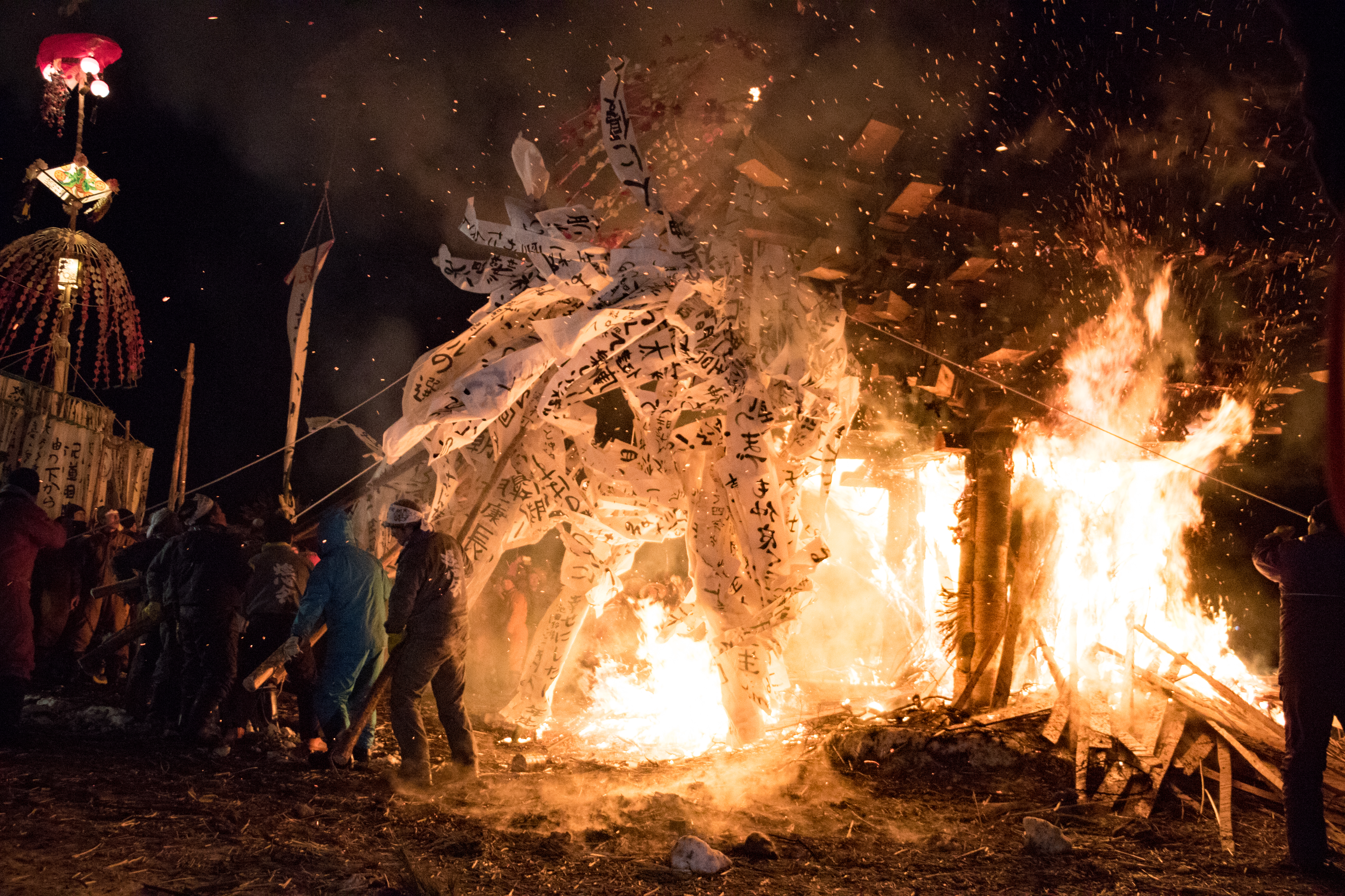 巨大な社殿に火をつけようとする村人と、守る25歳、42歳の厄年の男達が激しい攻防戦を繰り広げ、最後に社殿を燃やす、激しく壮大な奇祭である。